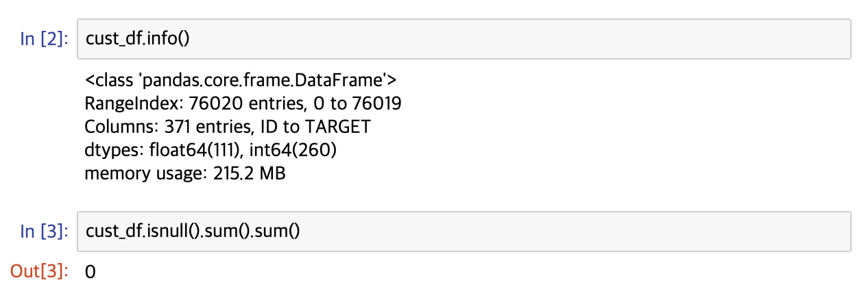 111개의 피처가 float형, 260개의 피처가 int형이며 NULL 값은 존재하지 않습니다.